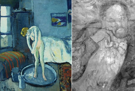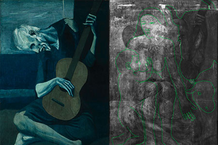 Trong những năm 1901-1904, hoàn cảnh của danh họa Picasso rất khó khăn, ông thậm chí không có đủ tiền để mua đồ nghề và phải dùng bìa các-tông thay cho giấy vẽ. Đôi khi ông tái sử dụng trên những giấy vẽ cũ của mình. Chính vì lẽ đó, môt trong những bức tranh rất nổi tiếng sau này của ông, bức The Old Guitarist đã được vẽ đè lên trên một tác phẩm khác.