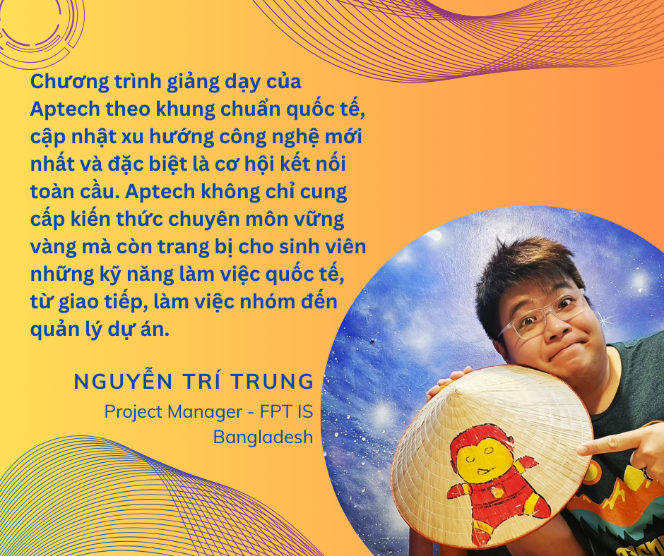 Nói về chính mình, anh Trung đã say mê lập trình cho nên khi tìm kiếm một môi trường học tập phù hợp, Aptech thu hút anh tò mò và tìm hiểu sâu. Chương trình giảng dạy của Aptech theo khung chuẩn quốc tế, cập nhật xu hướng công nghệ mới nhất và đặc biệt là cơ hội kết nối toàn cầu. Aptech không chỉ cung cấp kiến thức chuyên môn vững vàng mà còn trang bị cho sinh viên những kỹ năng làm việc quốc tế, từ giao tiếp, làm việc nhóm đến quản lý dự án. Đây chính là lý do khiến anh lựa chọn Aptech, nơi anh tin rằng mình sẽ có nền tảng tốt nhất để theo đuổi đam mê và vươn ra thị trường lao động quốc tế.