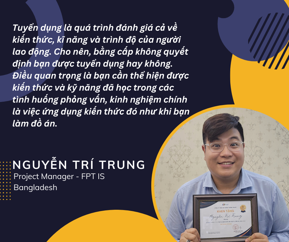 Với vai trò là quản lý dự án phải trực tiếp phỏng vấn nhân sự từ nhiều quốc gia trên thế giới, anh Trung thẳng thắn chia sẻ: “Tuyển dụng là quá trình đánh giá cả về kiến thức, kĩ năng và trình độ của người lao động. Cho nên, bằng cấp không quyết định bạn được tuyển dụng hay không. Điều quan trọng là bạn cần thể hiện được kiến thức và kỹ năng đã học trong các tình huống phỏng vấn, kinh nghiệm chính là việc ứng dụng kiến thức đó như khi bạn làm đồ án.”