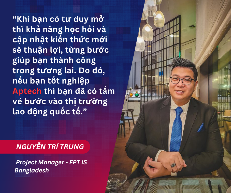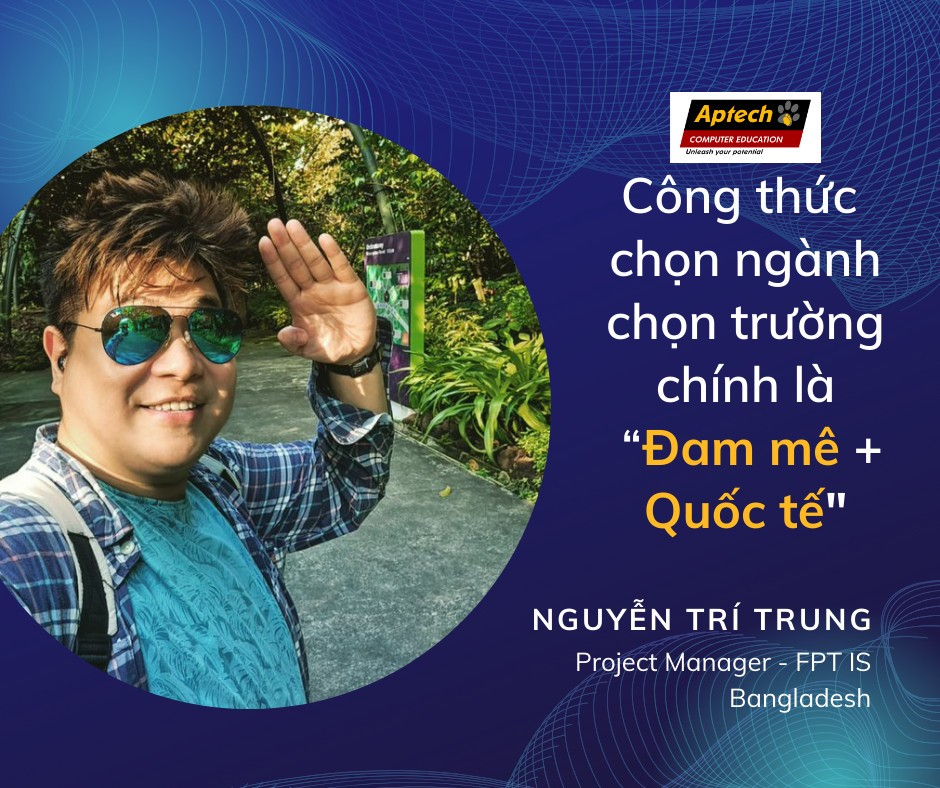 Ngay từ khi còn là sinh viên Aptech, anh Trung đã thành công được tuyển dụng vào tập đoàn CNTT hàng đầu Việt Nam. Và điều anh thấy tâm đắc và biết ơn nhất chính là quyết định trở thành sinh viên Aptech. Anh Trung đã được tiếp cận chương trình học theo chuẩn quốc tế cho nên tư duy logic tốt, dễ dàng tiếp cận và học tập kiến thức mới như các khóa học chuyên môn trên coursera/udemy, các chứng chỉ nghiệp vụ của Google,... Đến bây giờ, khi nhìn lại hành trình của bản thân, anh Trung vẫn luôn tự hào là cựu sinh viên Aptech Việt Nam. Do đó, nếu bạn tốt nghiệp Aptech thì bạn đã có tấm vé bước vào thị trường lao động quốc tế.