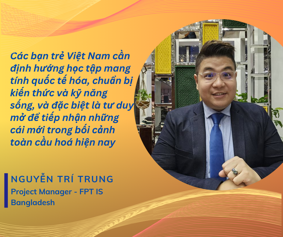 Với đam mê lập trình, từng bước nỗ lực học tập và hoàn thiện bản thân để sẵn sàng bước vào thị trường lao động toàn cầu, anh Trung đã cho thấy sinh viên Việt Nam đủ năng lực và trí tuệ để trở thành giám đốc dự án CNTT tầm cỡ quốc tế. Nói về con đường mình đã chọn, anh Trung vui vẻ chia sẻ: “Hành trình ra thế giới không chỉ là chinh phục những thử thách mới, mà còn là khẳng định bản lĩnh và tài năng của sinh viên Việt Nam trên bản đồ quốc tế. Các bạn trẻ Việt Nam cần định hướng học tập mang tính quốc tế hóa, chuẩn bị kiến thức và kĩ năng sống, và đặc biệt là tư duy mở để tiếp nhận những cái mới trong bối cảnh toàn cầu hoá hiện nay".