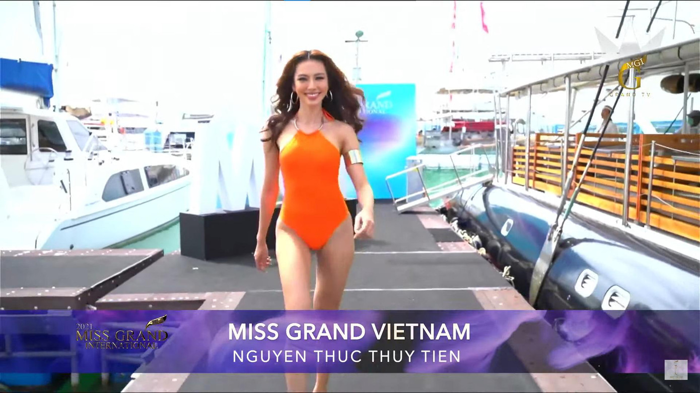 Như mọi năm, đại diện Việt Nam luôn được gọi tên cuối cùng dựa theo bảng chữ cái. Thùy Tiên xuất hiện như một vedette trong bộ bikini 1 mảnh sắc cam giúp tôn lên làn da rám nắng khỏe mạnh của người đẹp. Khán giả được dịp ngắm trọn body nóng bỏng của cô với số đo 3 vòng lần lượt là 83-62-92.