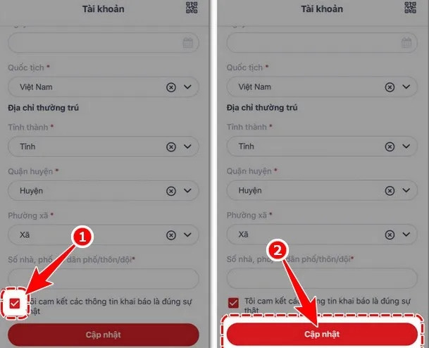 Bước 4: Di chuyển xuống dưới, tích chọn Tôi cam kết các thông tin khai báo là đúng sự thật, sau đó nhấn Cập Nhật.