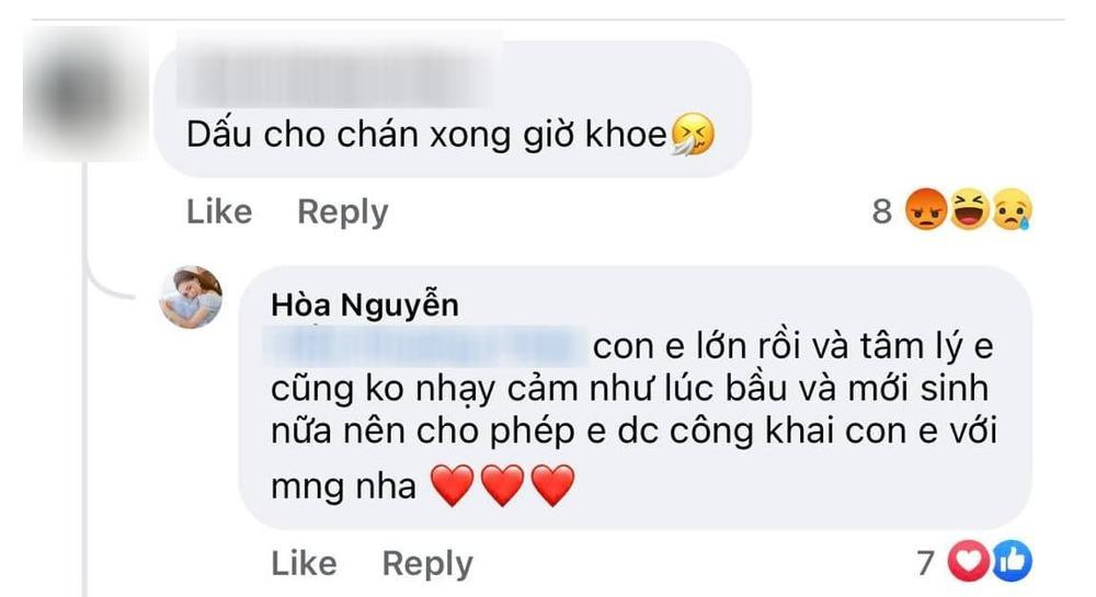Nữ ca sĩ nhanh chóng đáp trả: "Con em lớn rồi, và tâm lý em cũng không nhạy cảm như lúc bầu và lúc mới sinh nữa, nên cho phép em được công khai con em với mọi người nha".