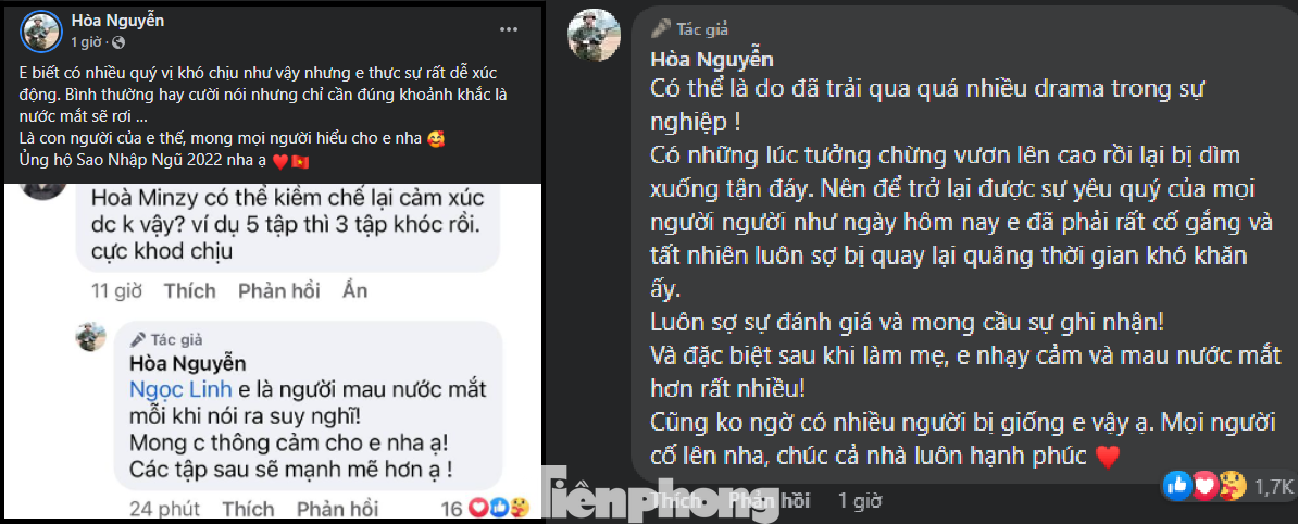 Trước những ý kiến góp ý của khán giả, nữ ca sĩ đã lên tiếng giải thích về khung cảnh xúc động trên. “Em biết có nhiều quý vị khó chịu như vậy nhưng em thực sự rất dễ xúc động. Bình thường hay cười nói nhưng chỉ cần đúng khoảnh khắc là nước mắt sẽ rơi… Là con người của em thế, mong mọi người hiểu cho em nhé. Ủng hộ Sao Nhập Ngũ 2022 nhé ạ", Hòa Minzy viết trên trang cá nhân.