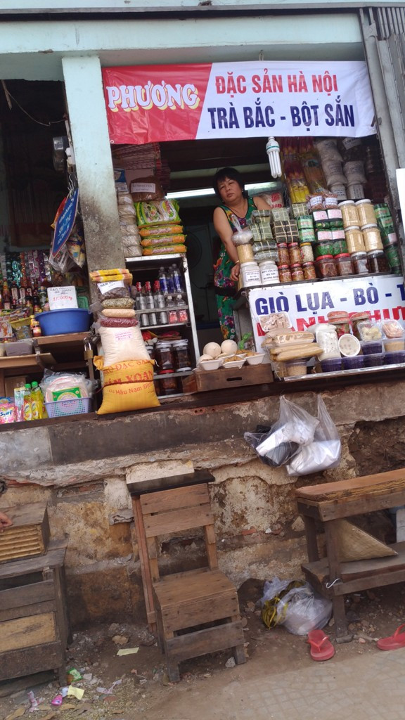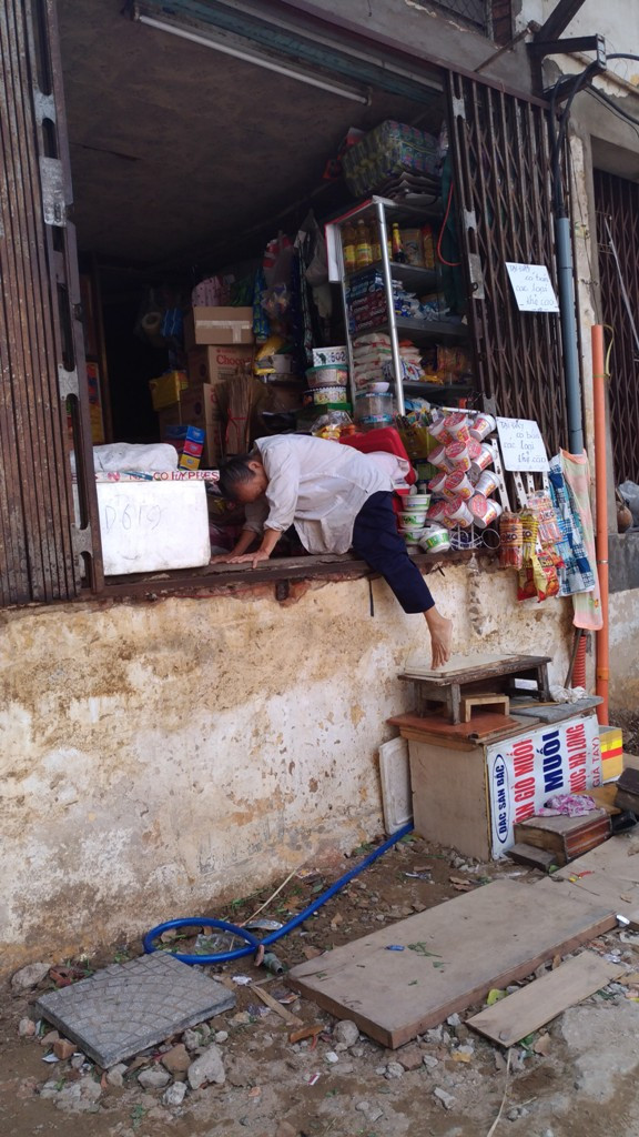 Chị Phương, chủ tiệm tạp hóa bán đặc sản Hà Nội phải đóng tạm mấy cái ghế gỗ để làm bậc thang leo vào nhà.