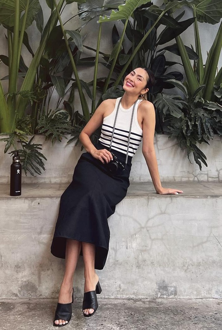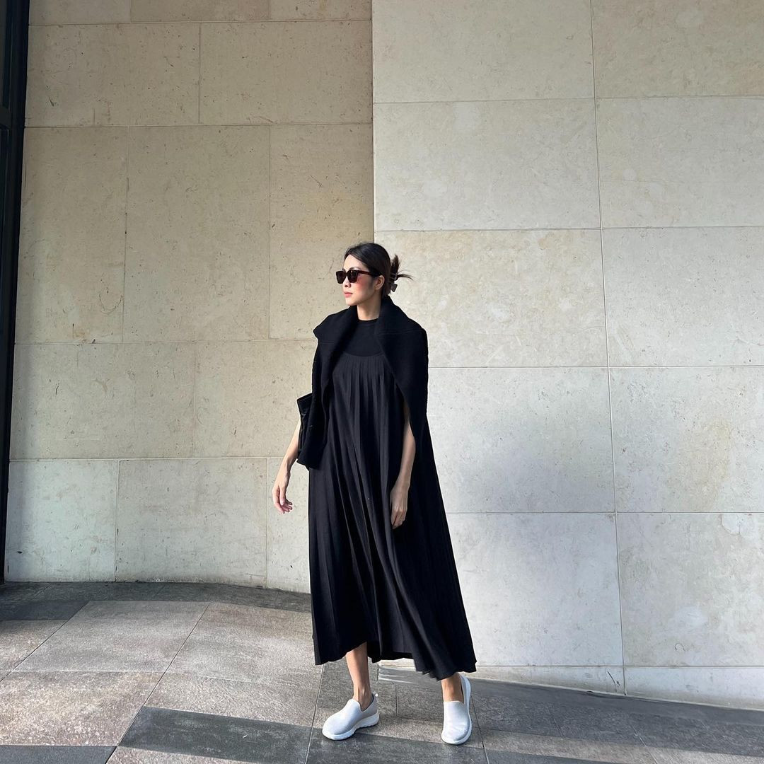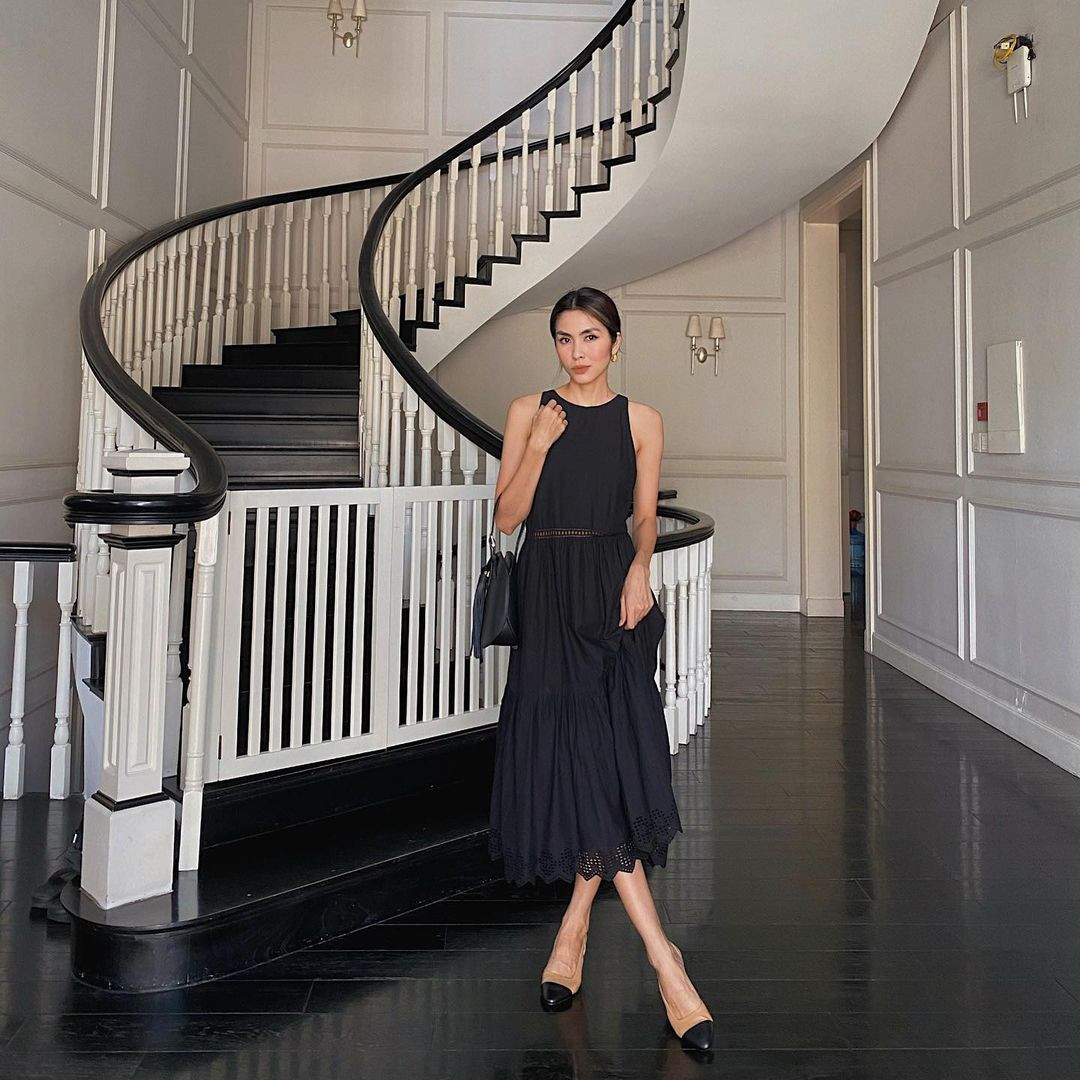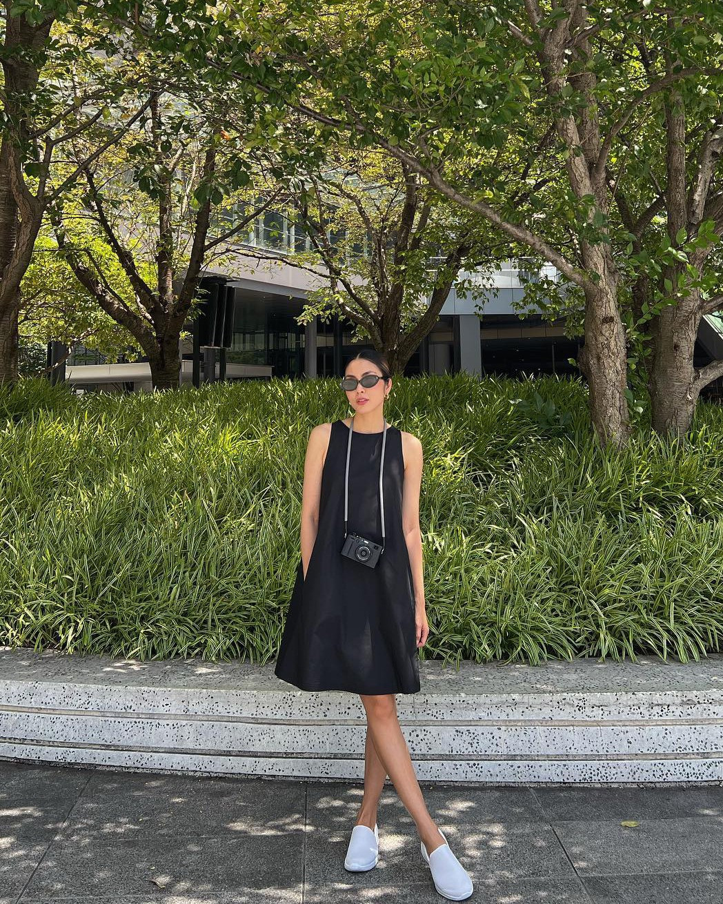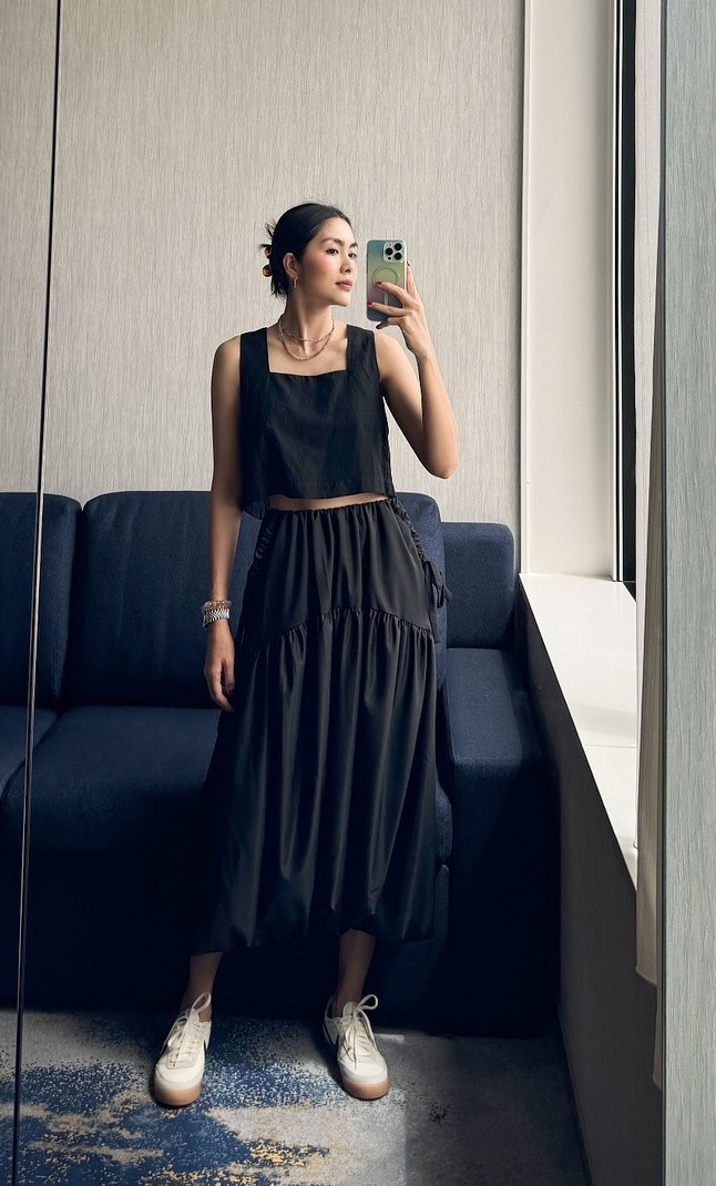 Khi đi du lịch, Tăng Thanh Hà luôn ưu tiên trang phục đen toàn tập. Nếu không phải đầm đen thì cũng là quần và áo đen đồng bộ. Tuy diện cả cây đen nhưng ngọc nữ màn ảnh Việt khéo léo tạo điểm nhấn ở đôi giày trắng hoặc phụ kiện máy ảnh nên nhìn cô không hề già.