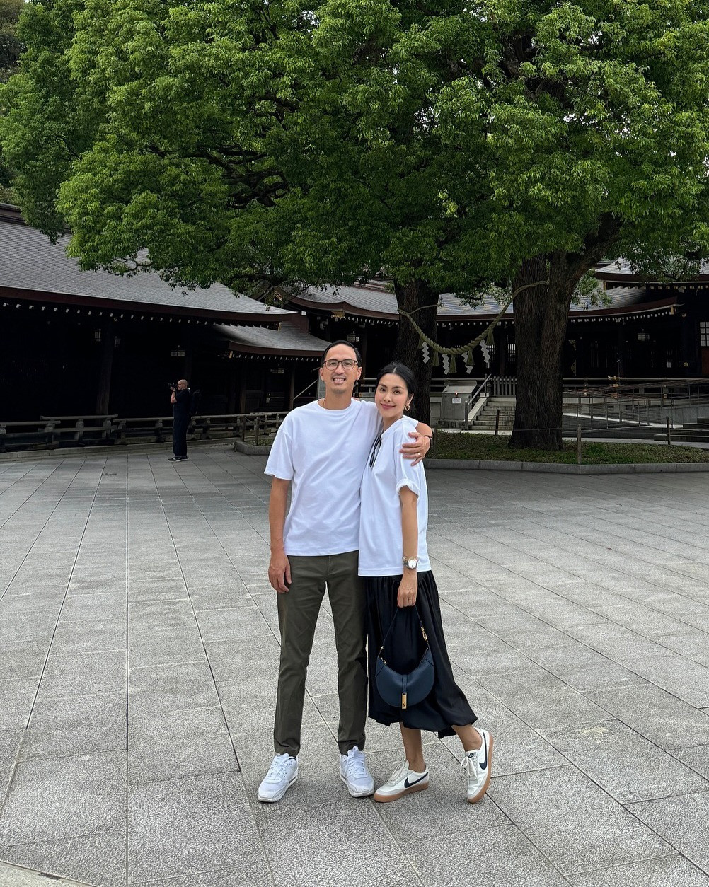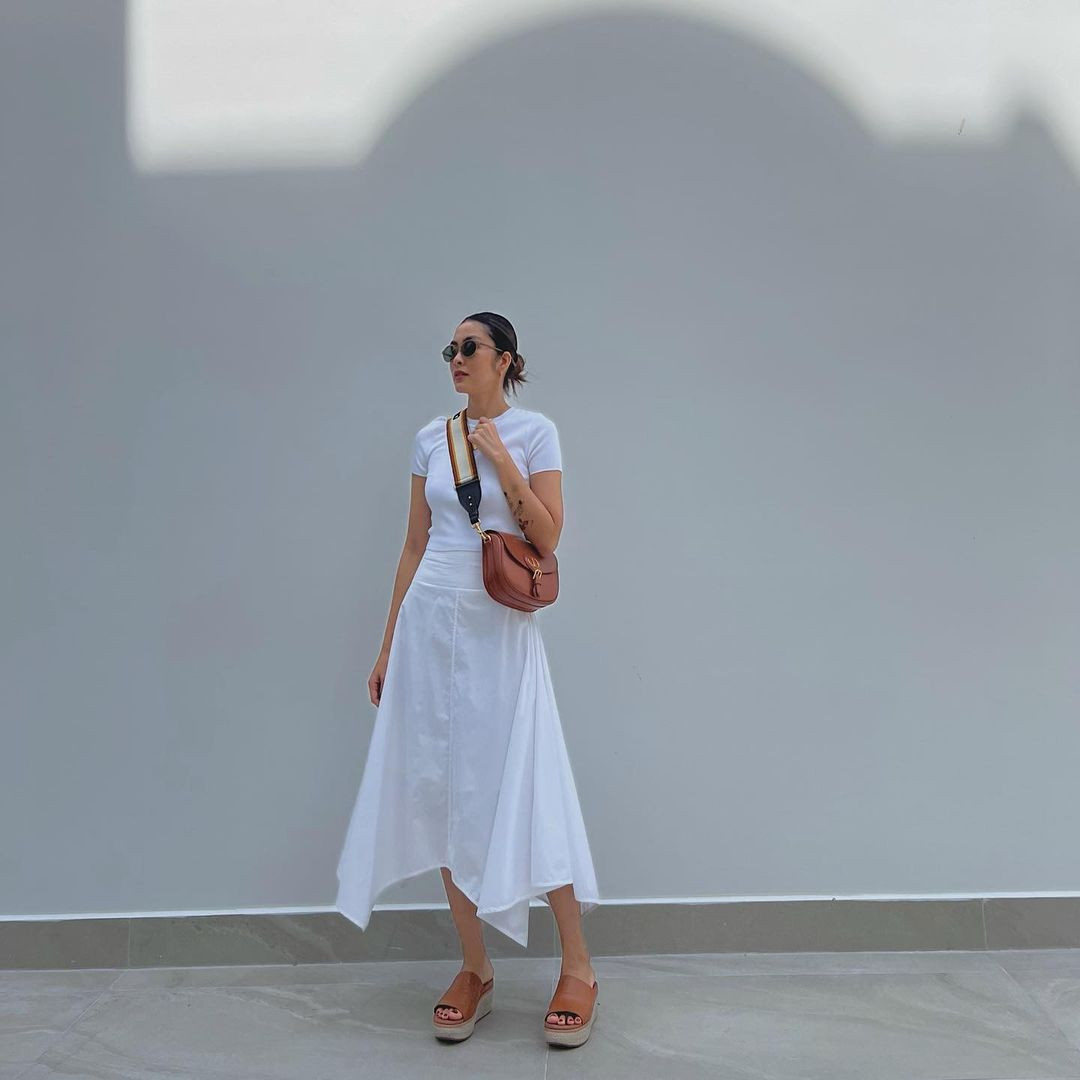 Quả thực trước đây, Hà Tăng thường mặc váy áo có màu sắc rực rỡ ngọt ngào nhưng hiện giờ, cô nghiêng hẳn về style cổ điển, trang nhã với hai gam màu đen và trắng. Như trong chuyến du lịch Nhật Bản với ông xã, Tăng Thanh Hà chỉ kết hợp áo thun trắng với chân váy đen như thế này.