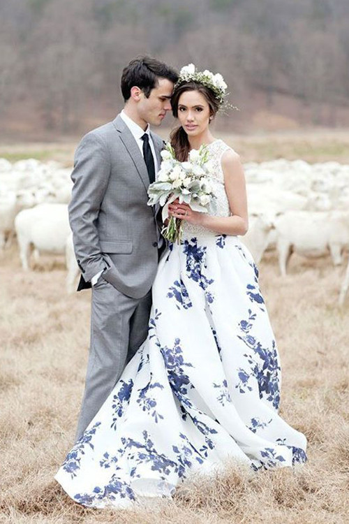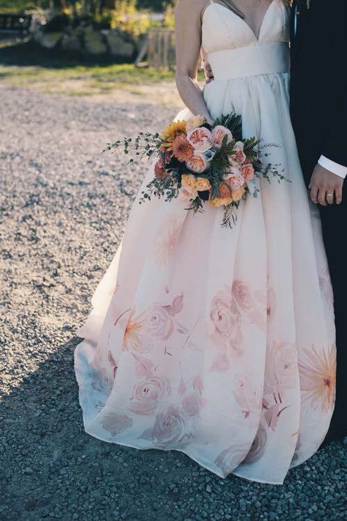 Nếu tổ chức đám cưới ngoài trời, họa tiết hoa trên váy trở càng đồng điệu với không gian.
