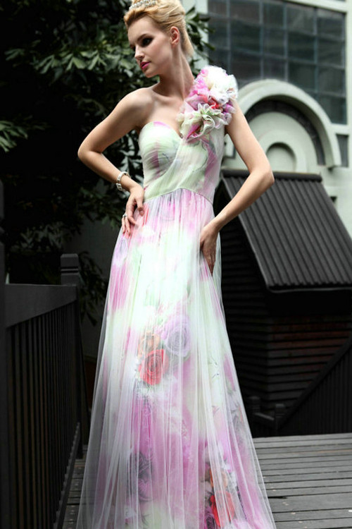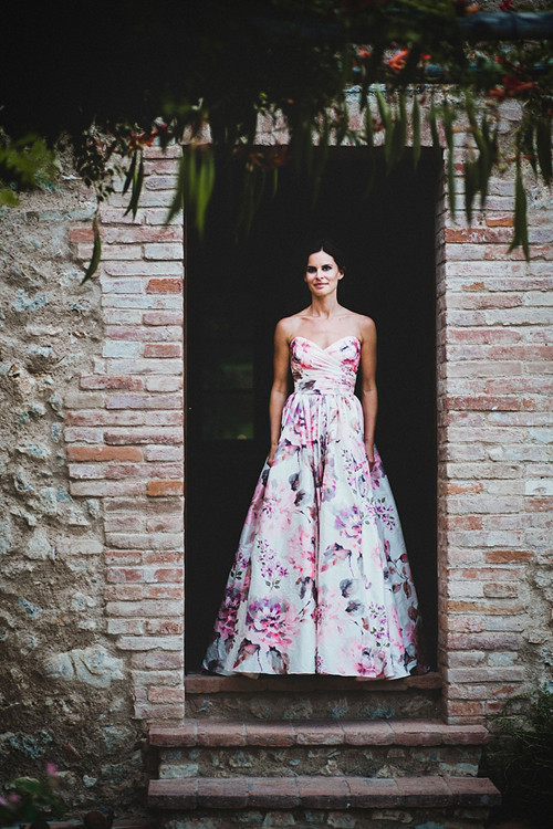 Váy lụa in hoa làm cô dâu đẹp sang trọng.