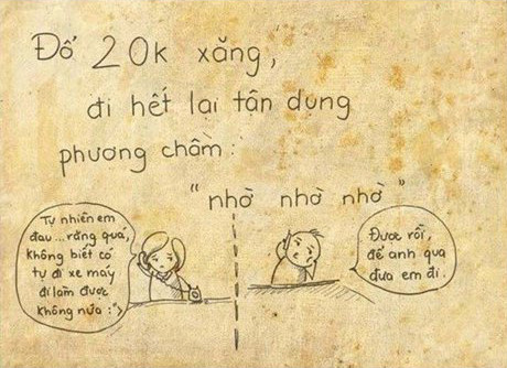 “Thật may vì bạn là con gái vì khi xe bạn hết xăng, sẽ có chàng chở bạn đi mọi nơi. Nếu bạn là con trai, thì đừng nói đến việc nhờ chở đi. Nếu xe bạn là xe cùi, thì có chở con gái cũng chưa chắc đi với bạn”, nick Bợm nửa đùa nửa thật.
