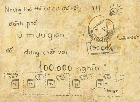 Bộ tranh vẽ tựa đề Đừng chết với 100k của tác giả Cú Công Sở đang khiến đông đảo bạn trẻ cười ngất với lối vẻ hài hước cùng nội dung dí dỏm. Lấy ý tưởng từ sự vụ hẹn hò cùng bạn gái với 100k gây xôn xao cách đây không lâu, câu chuyện diễn tả nỗi khổ sở của một cô nàng khi còn 5 ngày nữa mới lãnh lương, song trong túi chỉ còn 100k.