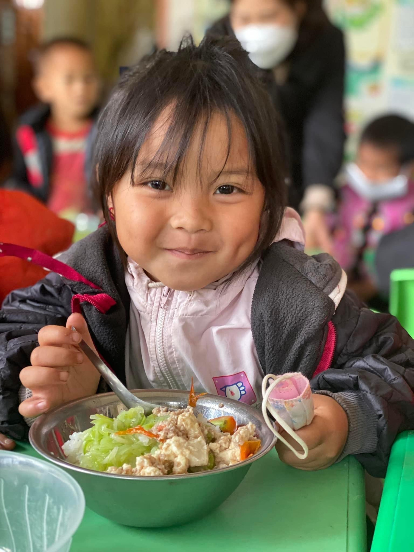 | Niềm vui của những đứa trẻ vùng cao bên những bữa cơm trưa đầy đủ dinh dưỡng. Ảnh: NVCC |