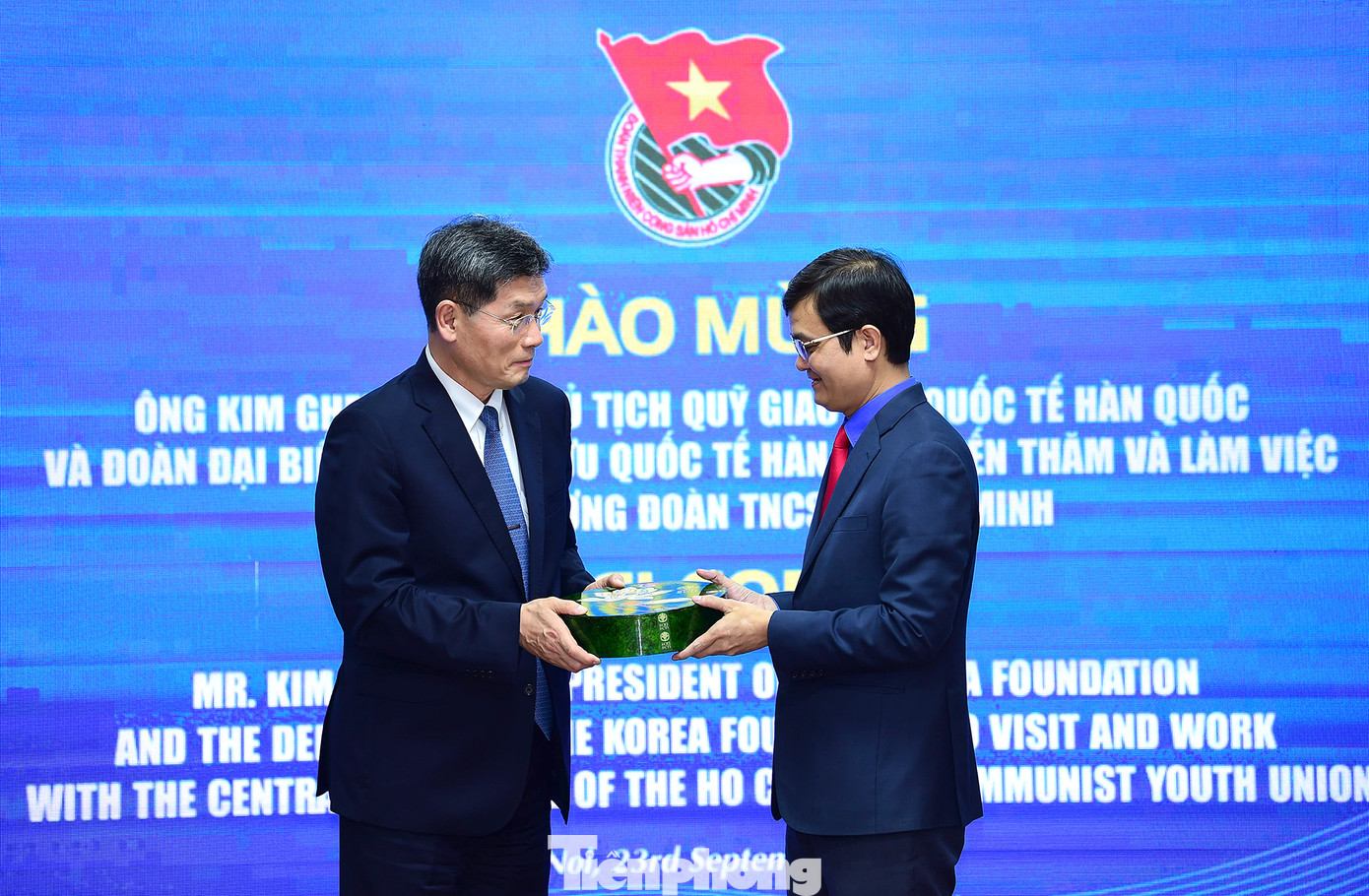 | Dịp này, Bí thư thứ nhất T.Ư Đoàn Bùi Quang Huy tặng quà Chủ tịch Quỹ Giao lưu Quốc tế Hàn Quốc Gheewhan Kim. Ảnh: Xuân Tùng |