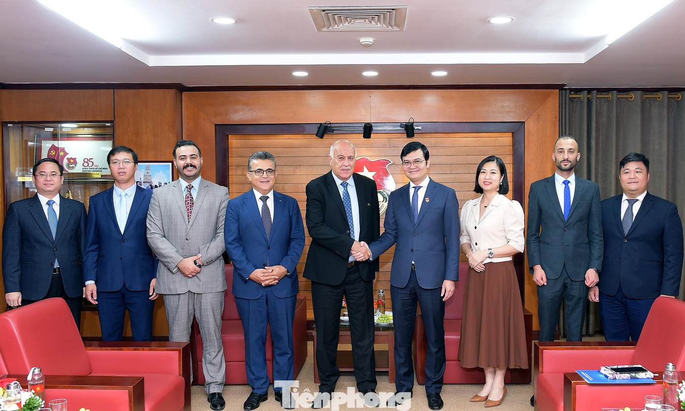 Bí thư thứ nhất Trung ương Đoàn Bùi Quang Huy chào mừng Thường trực Ban Bí thư Đảng Phong trào Giải phóng Dân tộc Palestine Jibril M.M Alrajoub thăm và làm việc với Trung ương Đoàn.