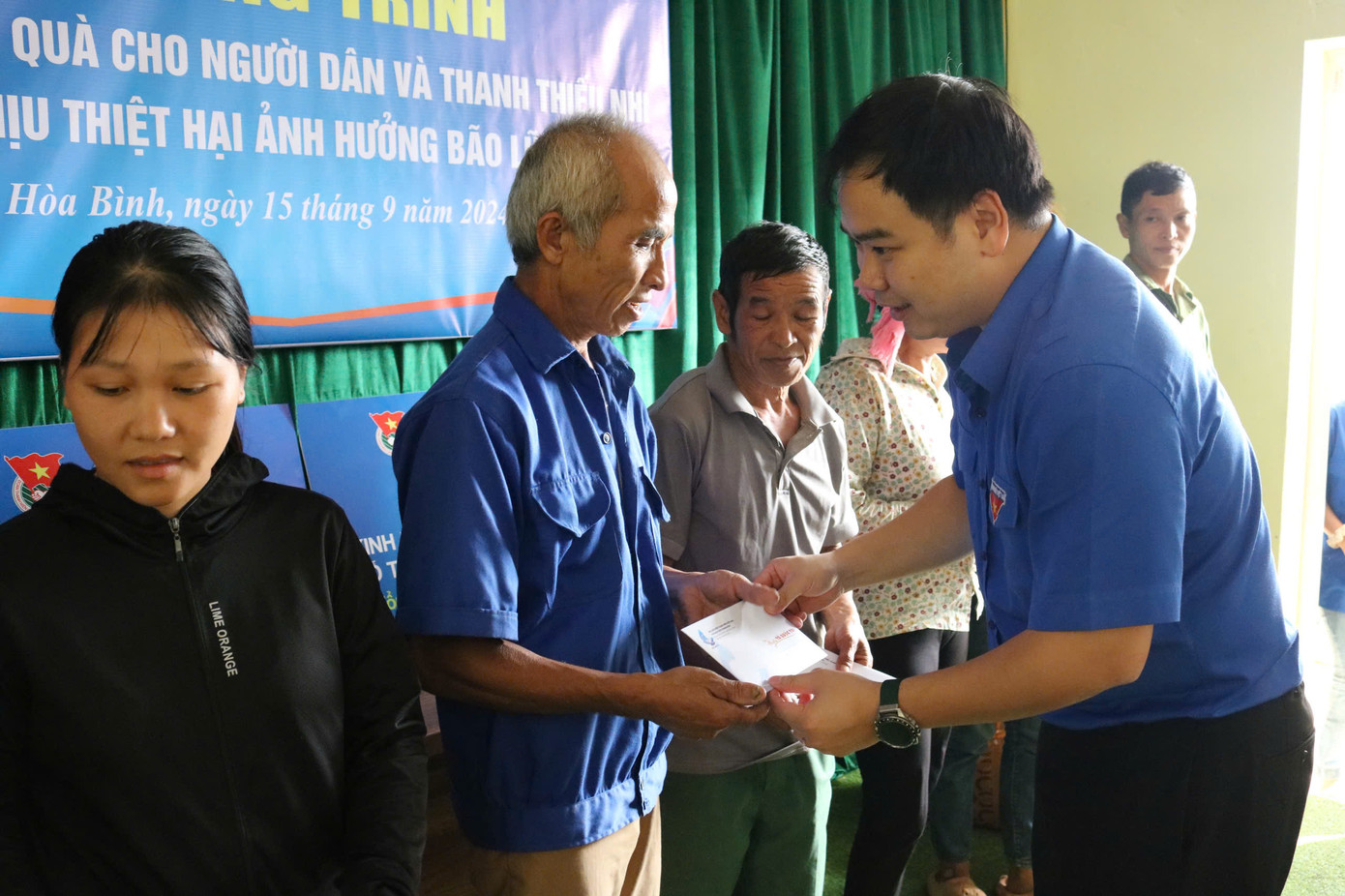 | Anh Nguyễn Xuân Hiếu - Phó trưởng Ban Đoàn kết tập hợp thanh niên T.Ư Đoàn trao tặng nguồn lực hỗ trợ người dân Hòa Bình khắc phục hậu quả bão số 3. |