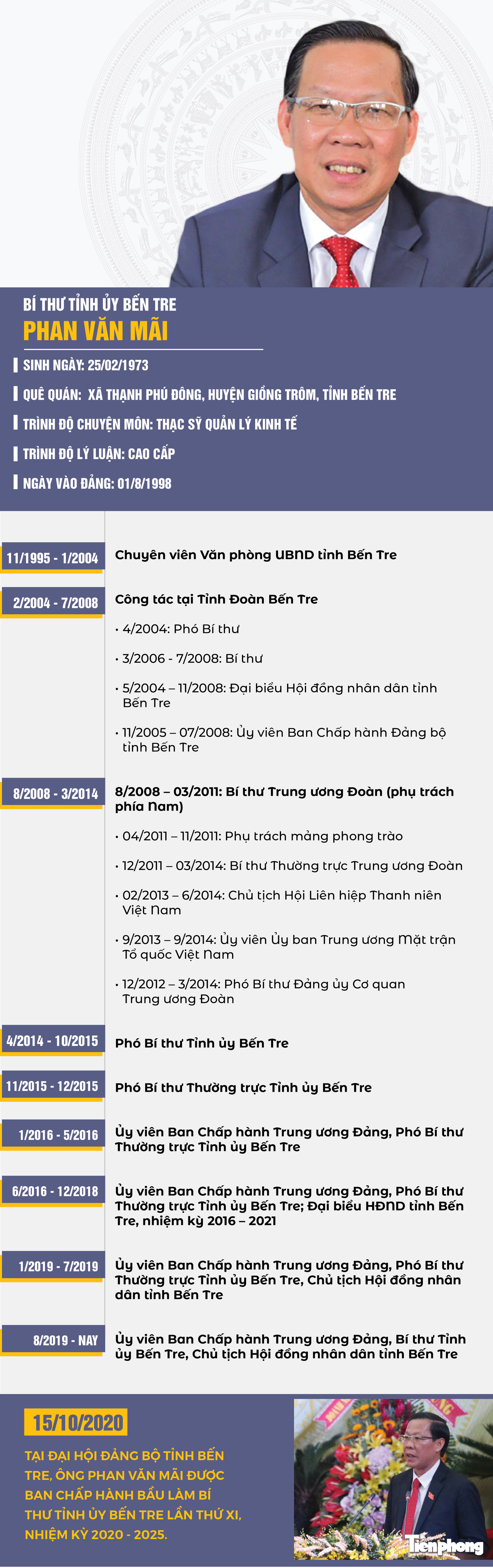 TPO - Ngày 15/10/2020, tại Đại hội Đảng bộ tỉnh Bến Tre, ông Phan Văn Mãi, Bí thư Tỉnh ủy được Ban chấp hành bầu làm Bí thư Tỉnh ủy Bến Tre lần thứ XI, nhiệm kỳ 2020 - 2025.