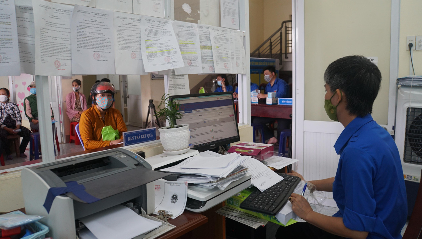 | Anh Nguyễn Minh Triết thăm sinh viên tình nguyện đang giúp dân làm thủ tục hành chính tại xã Xuân Hòa. - Ảnh: Hòa Hội |