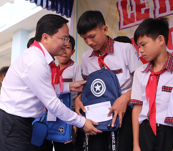 Chị Nguyễn Huỳnh Thu, Bí thư tỉnh Đoàn Vĩnh Long (áo xanh) tặng bảng tượng trưng tập, khăn quàng cho đại diện trường Với những phần quà dành tặng cho học sinh của trường, anh Tuấn chia sẻ, đây là tình cảm tổ chức Đoàn mong muốn học sinh khó khăn có thêm điều kiện đến trường. Đồng thời tiếp thêm niềm tin để các em phấn đấu vượt qua hoàn cảnh, chăm ngoan học giỏi và trở thành những người có ích cho gia đình và xã hội. Bên cạnh đó, anh Tuấn mong muốn cộng đồng xã hội tập trung hỗ trợ để không có trường hợp học sinh nào phải nghỉ học do hoàn cảnh khó khăn.
