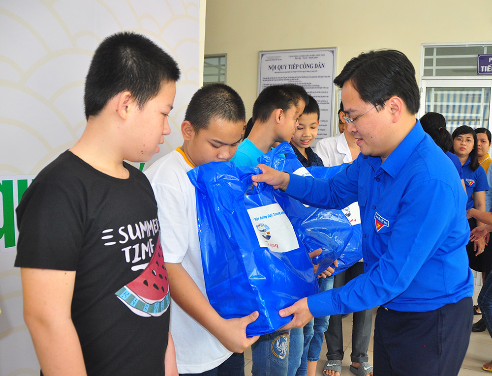 Bí thư thường trực Trung ương Đoàn tặng quà cho thiếu nhi ẢNH: HÒA HỘI