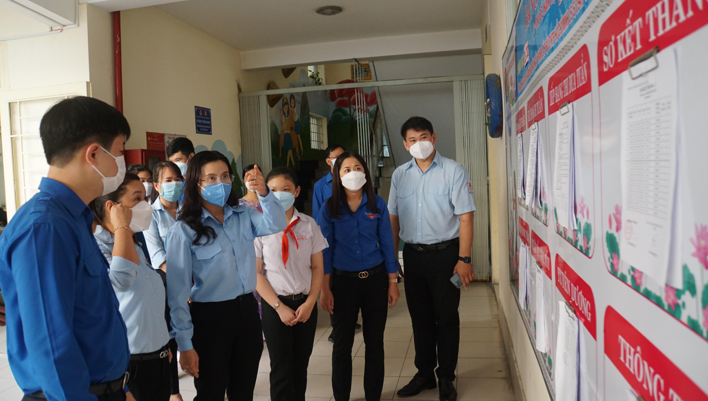 Tại đây, Đoàn công tác được nghe đại diện Ban Giám hiệu, Giáo viên làm Tổng phụ trách Đội thông tin về tình hình học tập và sinh hoạt của Đội viên.