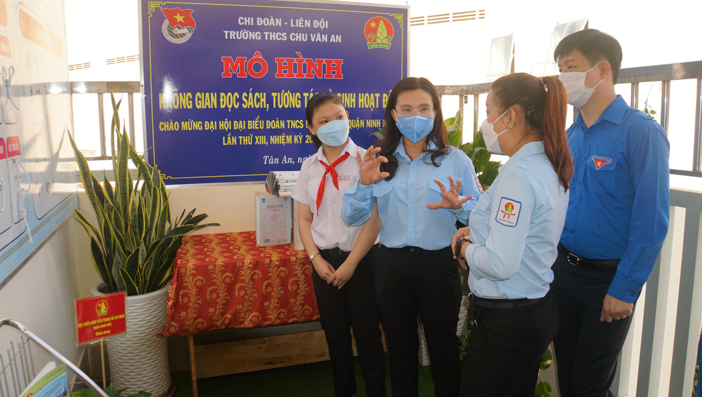 Chị Nguyễn Phạm Duy Trang cùng các anh chị trong Đoàn công tác đến thăm quan mô hình không gian đọc sách và sinh hoạt Đội. Đây là công trình măng non tiêu biểu của Liên đội Trường THCS Chu Văn An chào mừng Đại hội đại biểu Đoàn TNCS Hồ Chí Minh các cấp, tiến tới Đại hội Đoàn TNCS Hồ Chí Minh toàn quốc lần thứ XI, nhiệm kỳ 2022 - 2027.