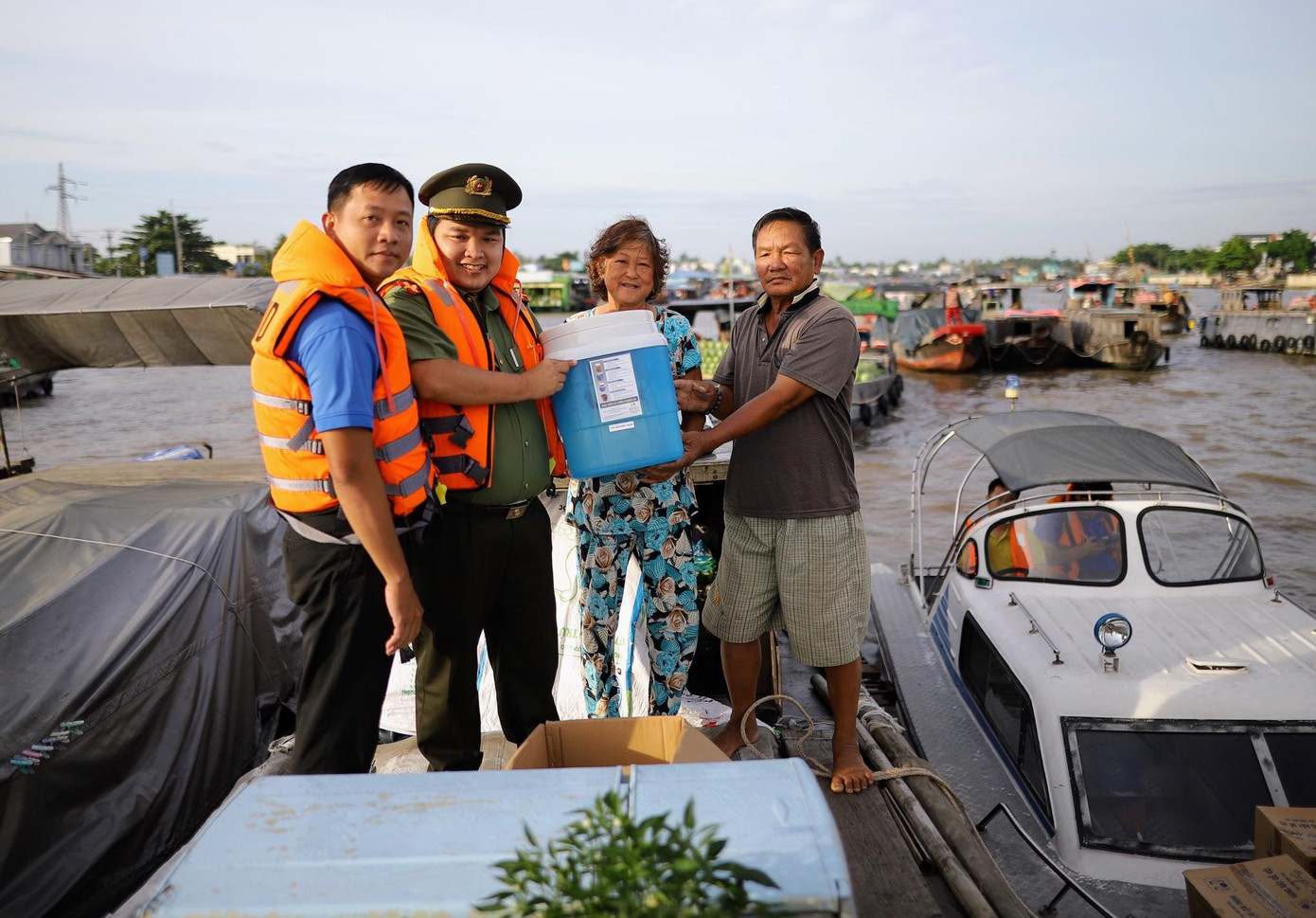 | Anh Ngô Văn Cương, Bí thư Trung ương Đoàn tặng bình lọc nước cho thương hồ chợ nổi Cái Răng. - Ảnh: Hòa Hội |