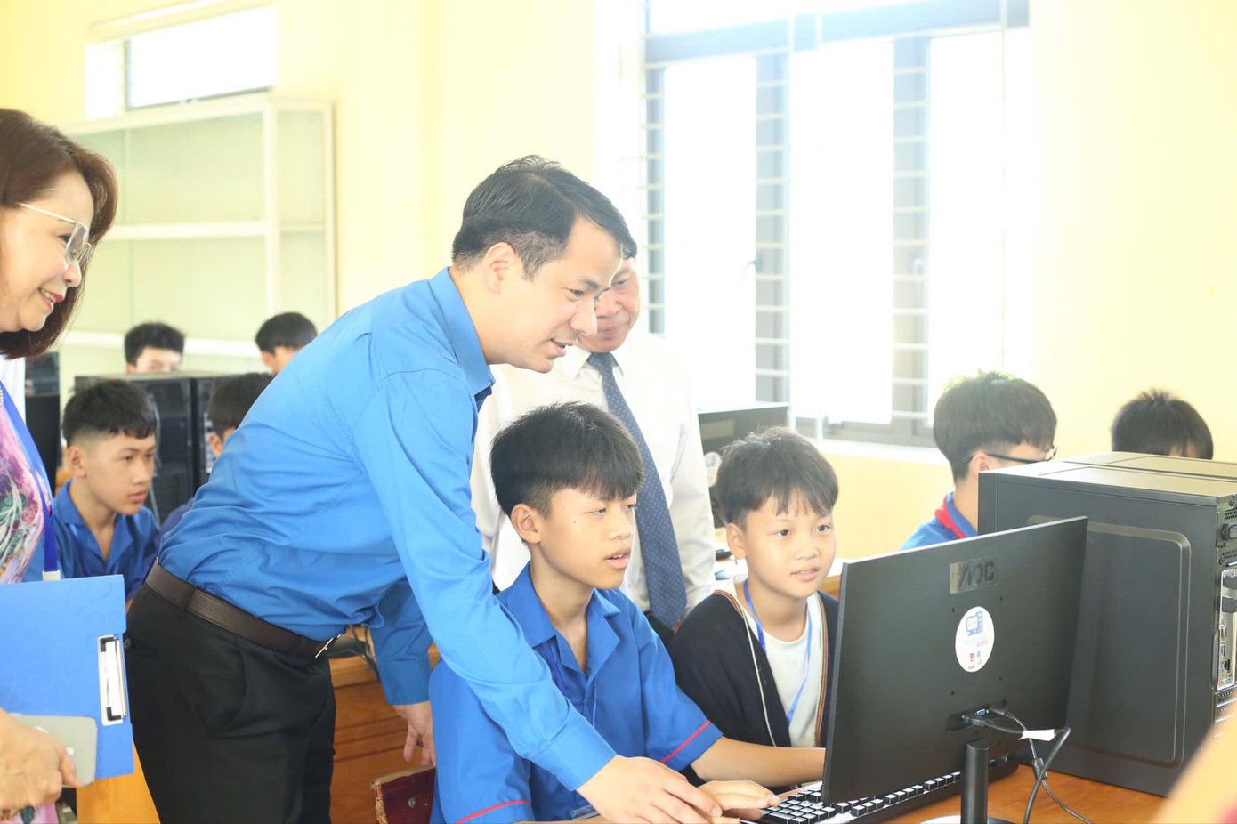 | Anh Ngô Văn Cương và các đại biểu khánh thành phòng máy tính cho học sinh của trường. |