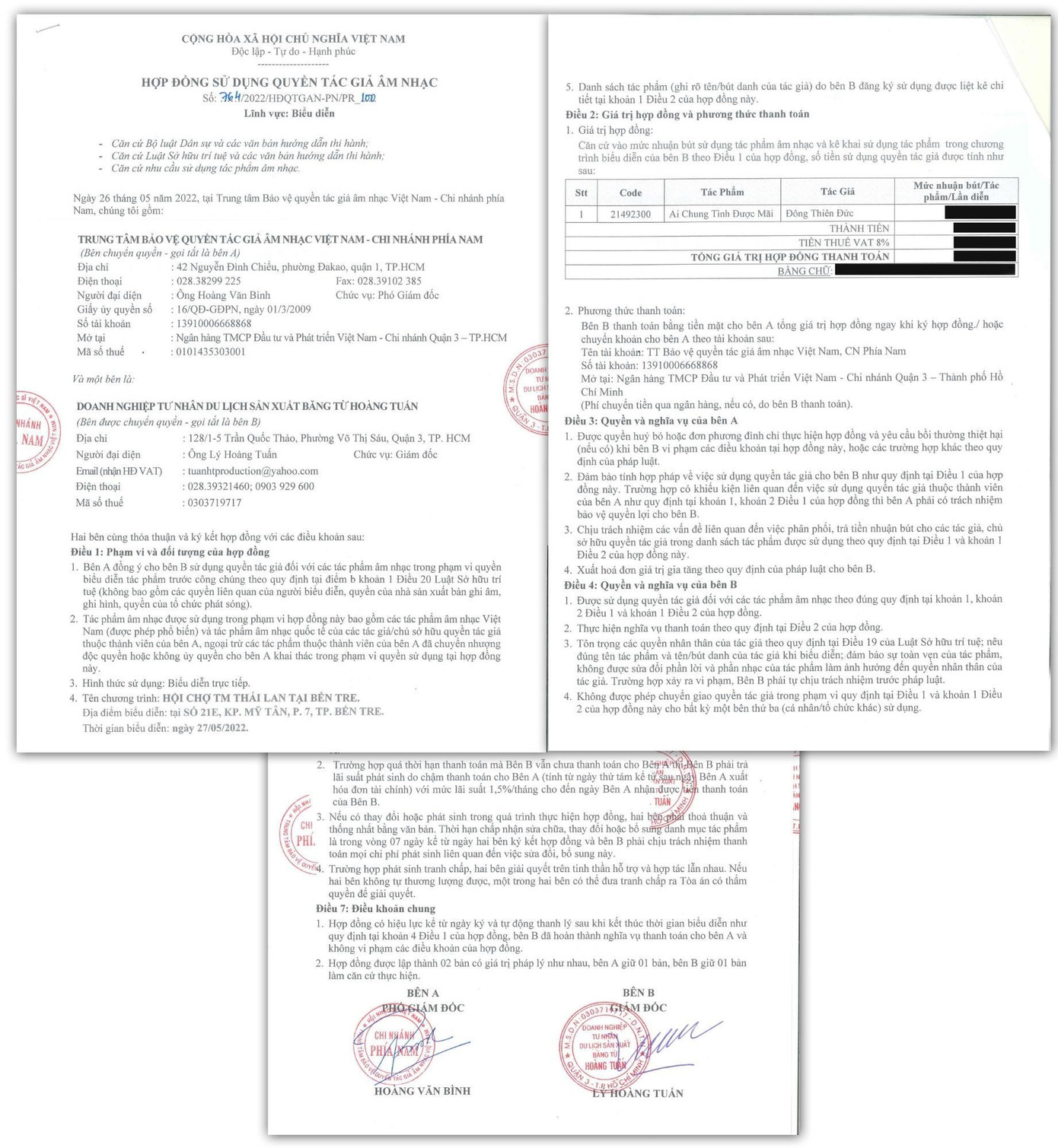 Phía Đan Trường cung cấp những giấy tờ liên quan đến Hợp đồng Sử dụng Quyền tác giả âm nhạc giữa Trung tâm Bảo vệ Quyền tác giả âm nhạc Việt Nam (Khu vực phía Nam) và HT Production. Trong nội dung hợp đồng nêu rõ ca sĩ Đan Trường được sử dụng ca khúc "Ai Chung Tình Được Mãi" tại sự kiện ở Bến Tre. Hợp đồng có hiệu lực từ khi ký kết (ngày 26/5/2022), vì vậy việc Đan Trường trình diễn ca khúc này tại sự kiện đó là hoàn toàn hợp lý.