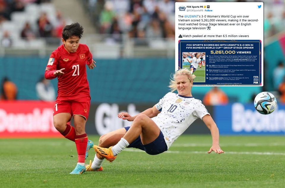 Chưa dừng lại ở đó, trận Mỹ gặp Việt Nam đã lập kỷ lục trong lịch sử trình chiếu các trận vòng bảng World Cup nữ trên kênh FOX, khi trung bình mỗi phút có 155 ngàn lượt khán giả truy cập.