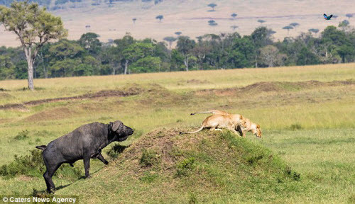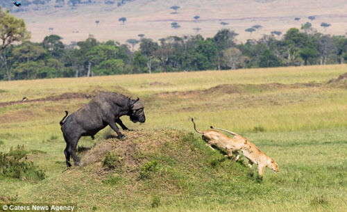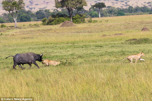 Trâu rừng hung dữ truy đuổi hai con sư tử. Một con sư tử thậm chí bị trâu rừng húc ngã, trong khi con còn lại cúp đuôi bỏ chạy theo hướng khác.