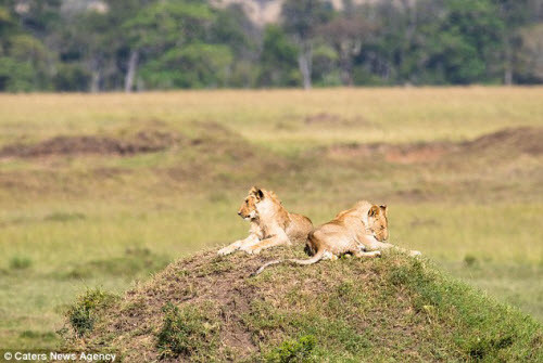 Hai con sư tử trước khi đi săn mồi cho bữa sáng của chúng trên vùng thảo nguyên ở Kenya.