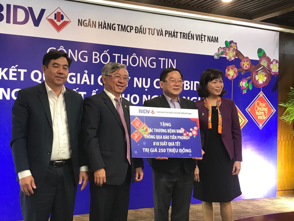 Tổng Biên tập báo Tiền Phong Lê Xuân Sơn nhận tượng trưng quà Tết từ ông Trần Xuân Hoàng, Phó Tổng giám đốc BIDV (thứ 2 từ trái qua) và bà Phan Thị Chinh (Ủy viên HĐQT BIDV). Số quà này BIDV và báo Tiền Phong sẽ trao cho các thương binh có cuộc sống khó khăn tại một số trung tâm thương binh nặng ở 10 tỉnh, thành trên cả nước.