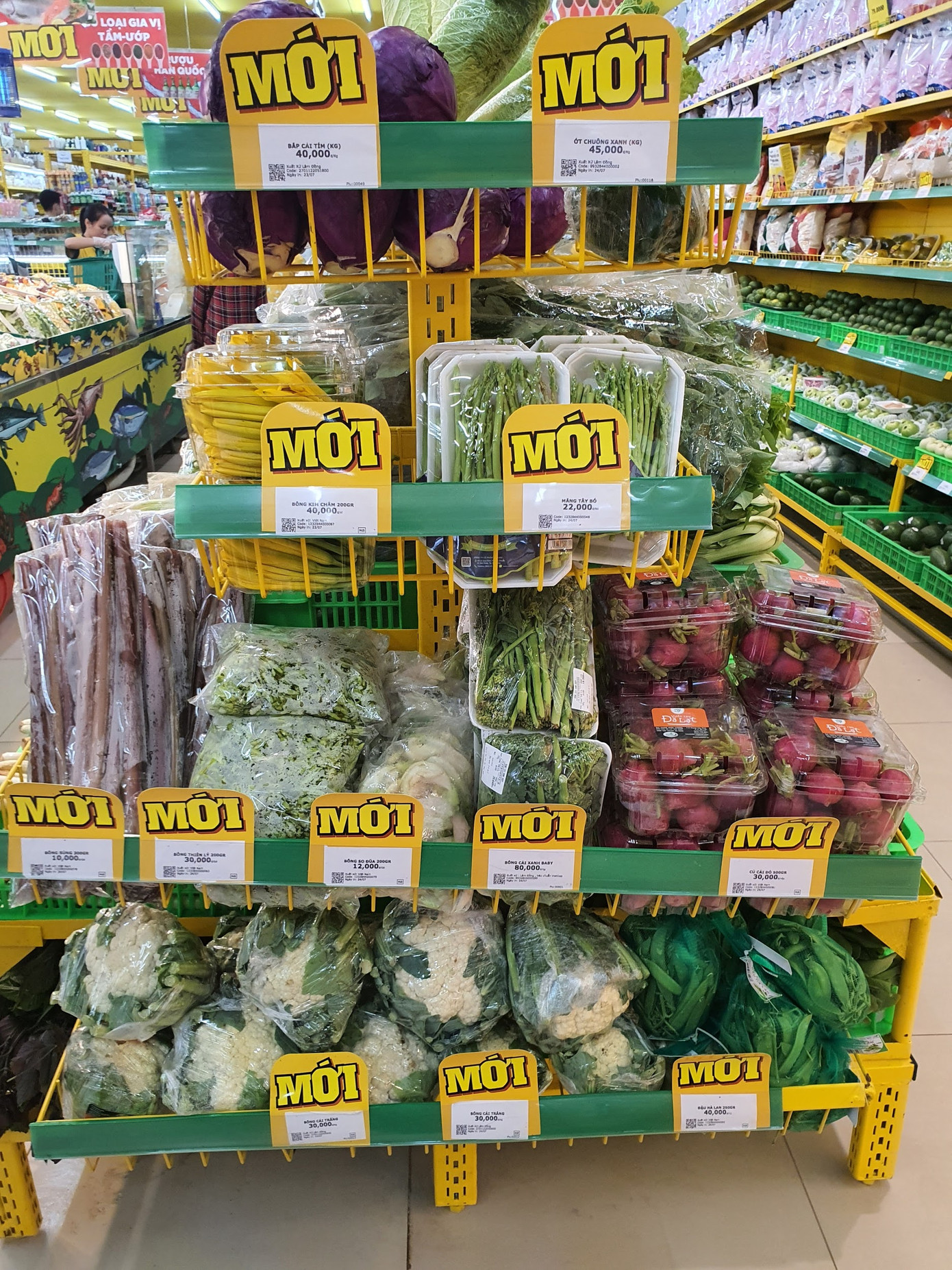 Không chỉ trưng bày đồ tươi sống ngoài sảnh hệt như chợ, Bách Hóa Xanh còn thay đổi hàng hóa trưng bày bên trong như một đại siêu thị. Và không khó để tìm thấy những quầy hàng được dán nhãn hàng mới, được chất đầy ắp trên các quầy kệ.