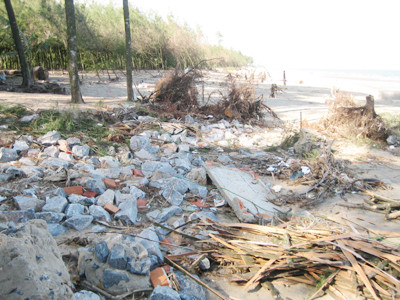 Tại khu du lịch sinh thái Vạn Chài ở xã Quảng Cư, các bờ kè bằng đá bị sóng biển phá vỡ, hàng nghìn cây phi lao chắn gió, phòng hộ bị bật gốc (ảnh) một số công trình của người dân, đường dẫn ra biển bị hư hại.