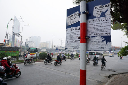 Gần như toàn bộ biển báo giao thông tầm thấp trên con đường này đều bị lợi dụng để dán quảng cáo.