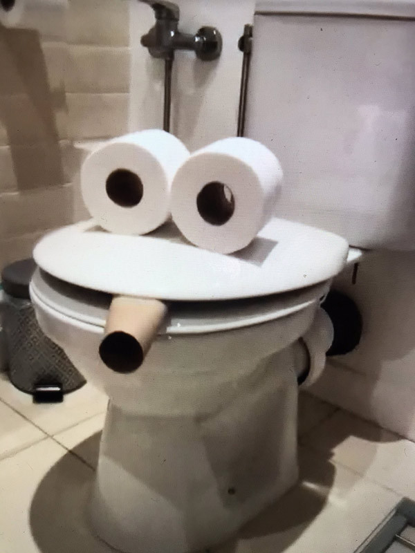 Người này đã dùng 2 cuộn giấy vệ sinh và một chiếc lõi thừa để "hô biến" chiếc bồn cầu quen thuộc trong nhà thành một khuôn mặt đang hút điếu xì gà.