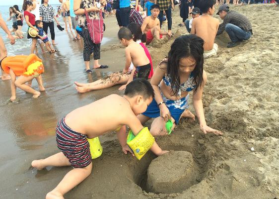 Trên bãi biển, hàng ngàn du khách cùng nhau thả mình vào dòng nước biển giải nhiệt ngày đầu hè. Các dịch vụ ăn uống hải sản, cho thuê áo tắm, áo phao,... rất đắt khách.