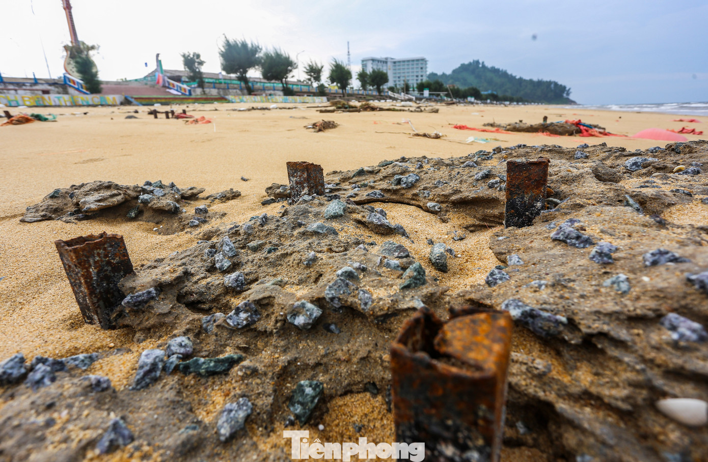 Sóng đánh mạnh cũng làm lộ những phiến bê tông có thép hoen gỉ, tiềm ẩn nguy cơ mất an toàn cho người đi lại trên bãi tắm.