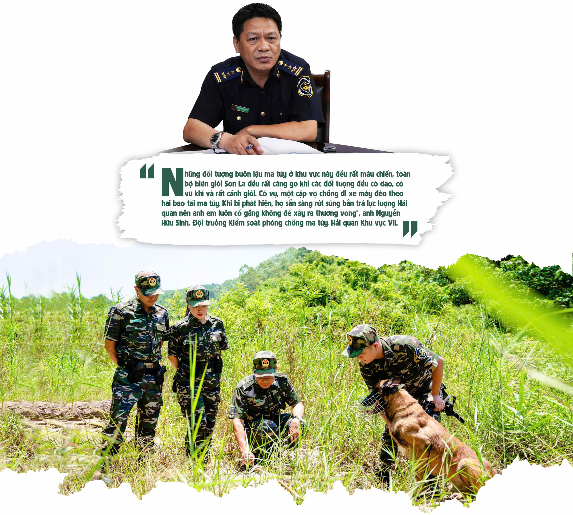 “Đáng báo động các đối tượng buôn lậu ma túy ở khu vực Điện Biên, Sơn La hiện lôi kéo những học sinh, thanh niên rất trẻ vào đường dây. Có lần chúng tôi bắt hai anh em ruột, rất đẹp trai, đang là học sinh, vác ma túy qua rừng. Hỏi ra thì chỉ được trả 5-10 triệu đồng. Với họ, đấy là cả gia sản. Nhưng đổi lại là án là bản án 20 năm tù, rất đau xót” - anh Nguyễn Hữu Sinh - Đội trưởng Đội Kiểm soát Phòng chống ma túy Hải quan Khu vực VII kể.