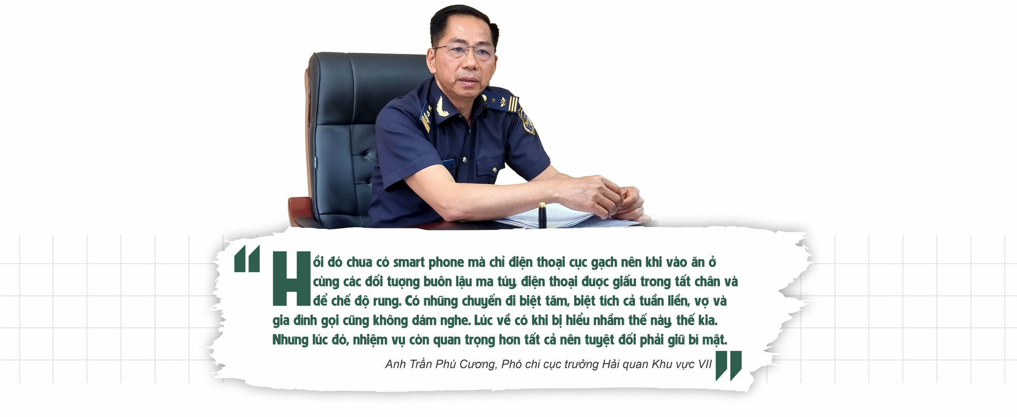 Khi hỏi về việc ghi hình lên sóng, anh lại khiêm tốn bảo “người làm công tác phòng chống ma túy thường không muốn xuất hiện nhiều. Chỉ cần phá được một vụ án, giữ được một bản làng bình yên, một đứa trẻ không sa vào nghiện ngập là đủ”. Ấy vậy trong bữa ăn tối khi nói về sự hi sinh của vợ, con và gia đình để anh toàn tâm với công việc, đôi mắt của cán bộ Hải quan ấy lại chợt hoen đỏ.