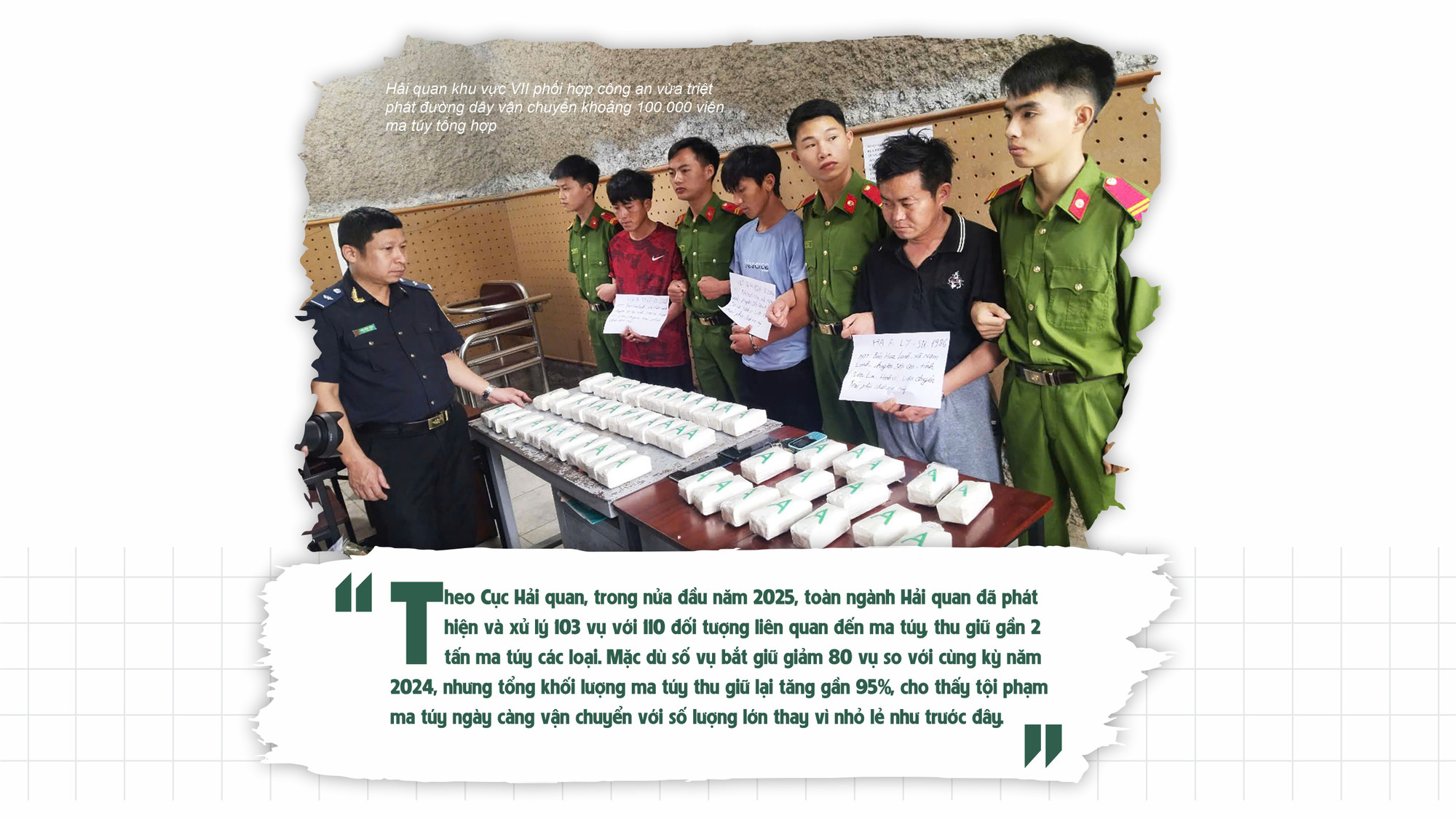Hay mới đây, giữa tháng 5/2025, Đội Kiểm soát Phòng chống ma túy Hải quan - Chi cục Hải quan Khu vực VII phối hợp với Phòng Cảnh sát điều tra tội phạm về ma túy Công an tỉnh Điện Biên triệt phá đường dây vận chuyển khoảng 100.000 viên ma túy tổng hợp, trọng lượng 9 kg, trong tháng cao điểm cả nước phòng chống buôn lậu, hàng giả, hàng nhái.