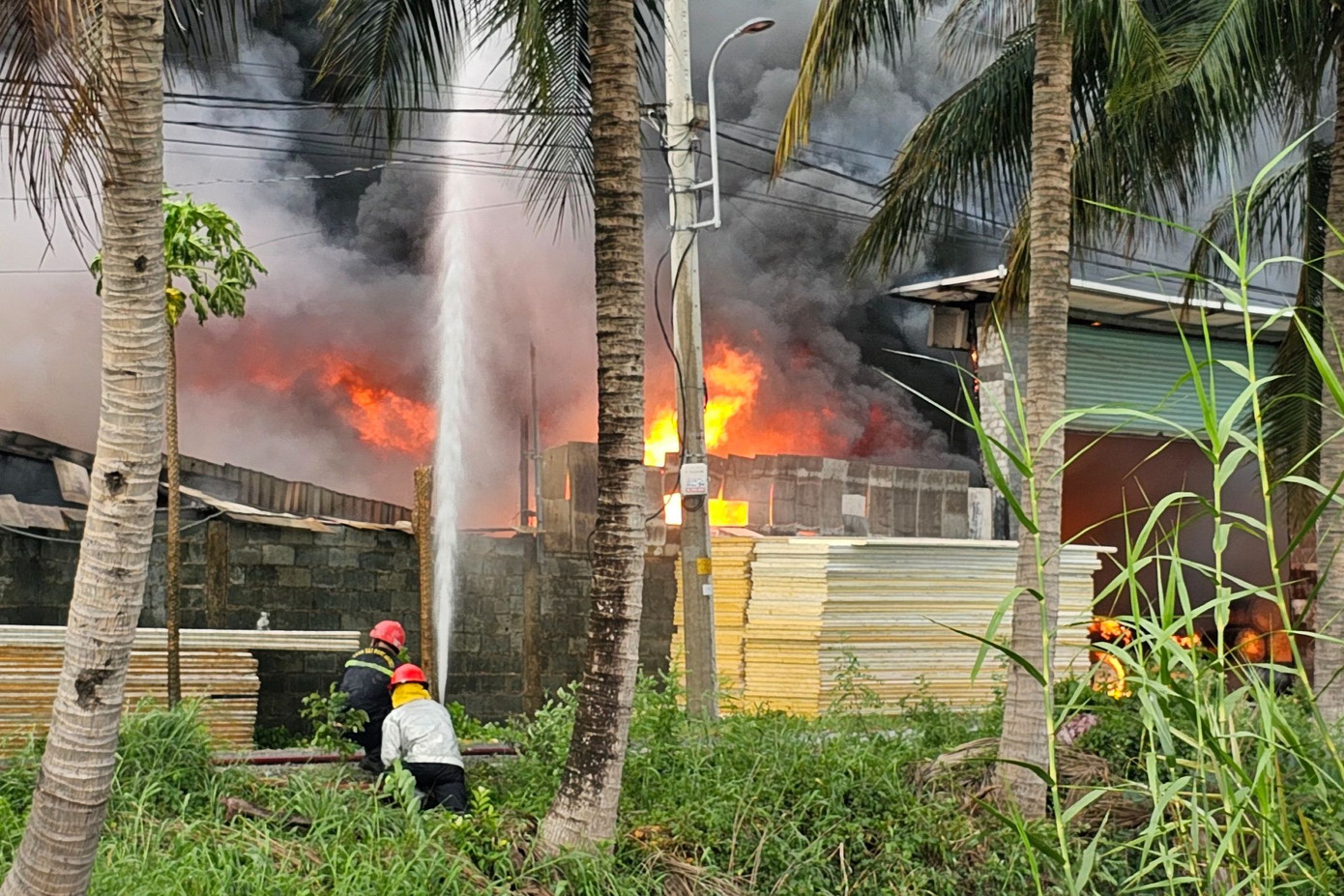 | Lửa đỏ rực và khói đen bao trùm nhà xưởng. |