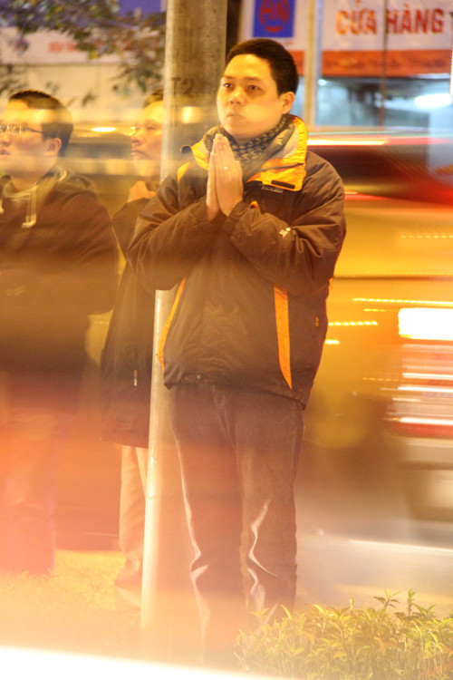 Không tìm được chỗ ngồi trước khu vực cửa chùa, người đàn ông này đứng thành tâm cầu nguyện bên dải phân cách trên cầu vượt Ngã Tư Sở.