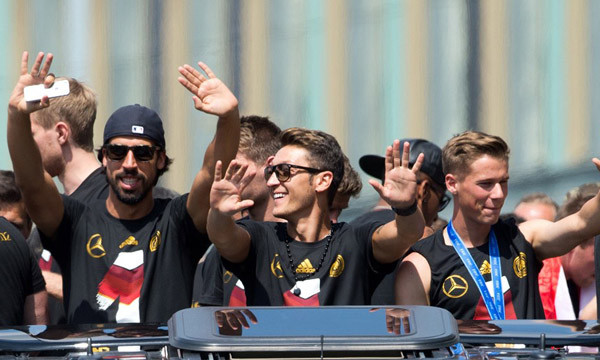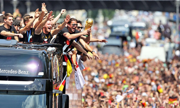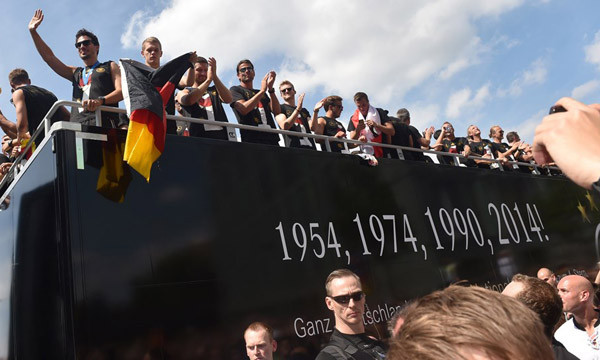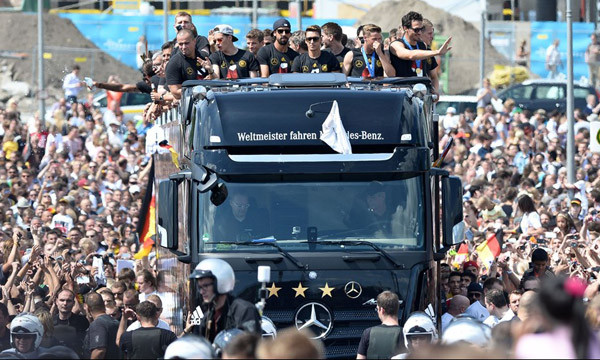Xe chở các tuyển thủ Đức rước Cup vàng tại Berlin. Trên chiếc xe có in các năm tuyển Đức lên ngôi vô địch thế giới.