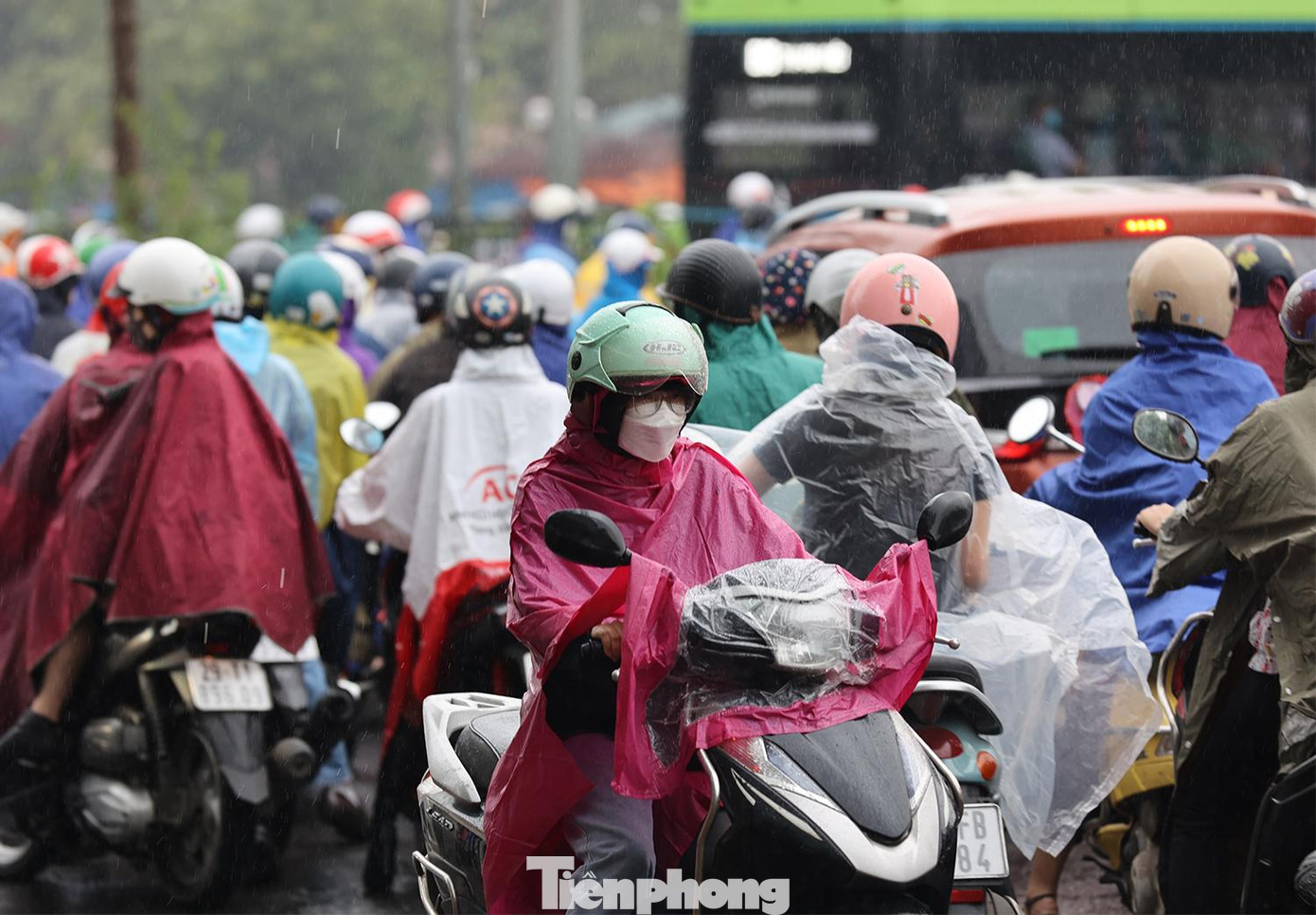 | Tại ngã tư Nguyễn Xiển - Nguyễn Trãi người dân chật vật chen chân trong mưa |