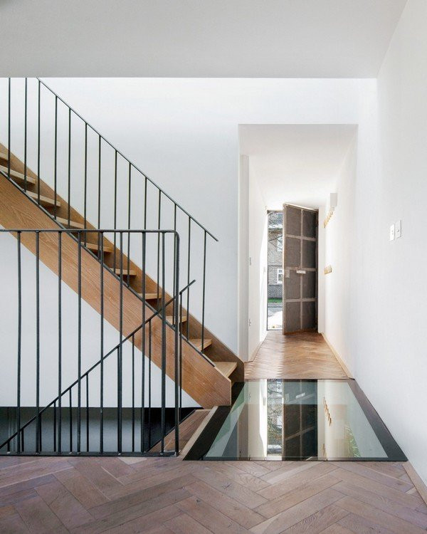 Cửa ra vào được tận dụng lại từ nhà để xe, sàn nhà làm từ gỗ tuyết tùng có cấu trúc dạng xương cá, cầu thang bằng gỗ màu sáng đem lại cảm giác ấm cúng cho ngôi nhà. Một phần sàn nhà làm bằng kính giúp cung cấp ánh sáng tự nhiên cho tầng hầm, và là điểm nhấn trong thiết kế.