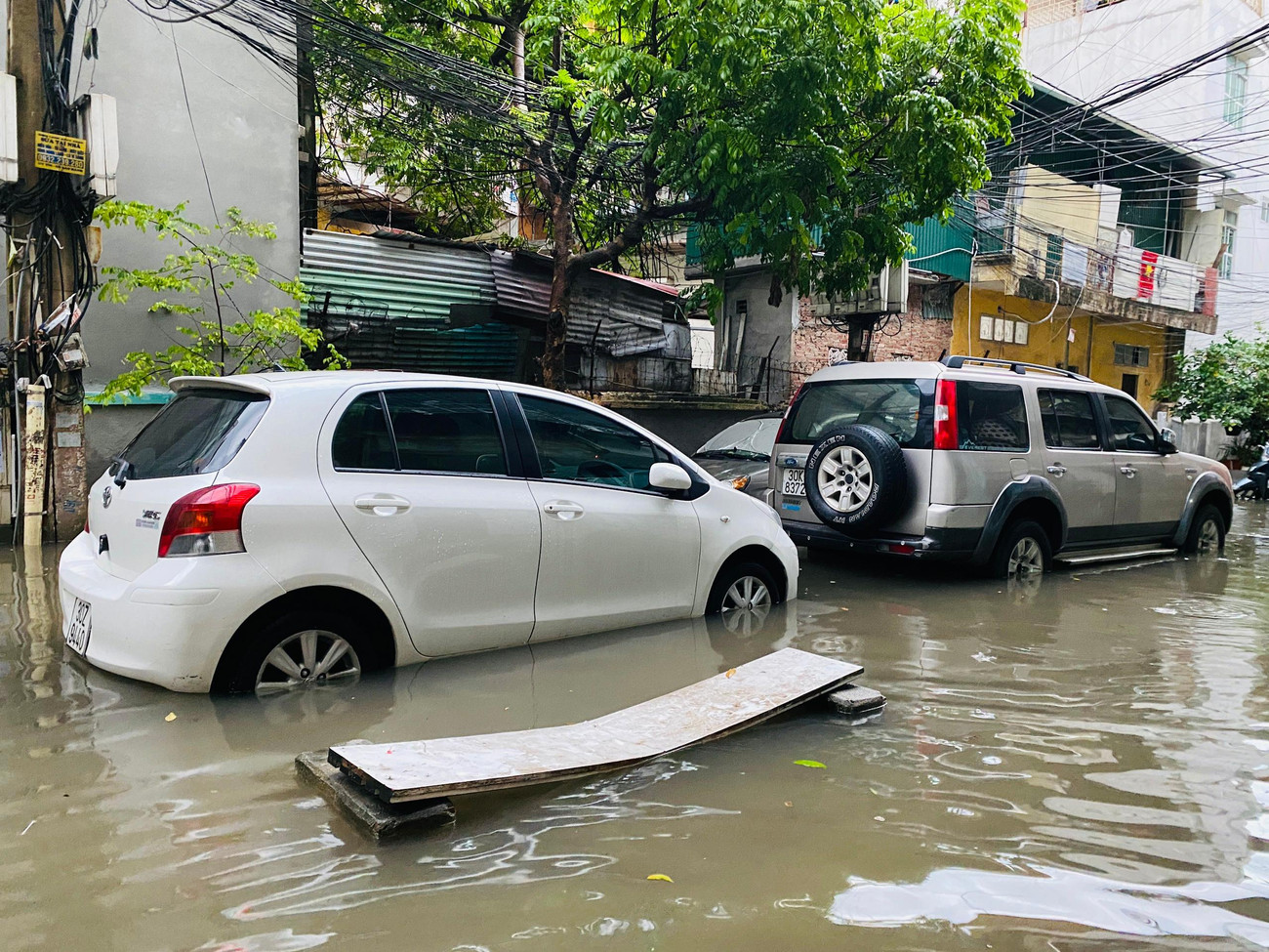 Nhiều ô tô chìm trong nước khi đỗ tại phố Thái Hà.