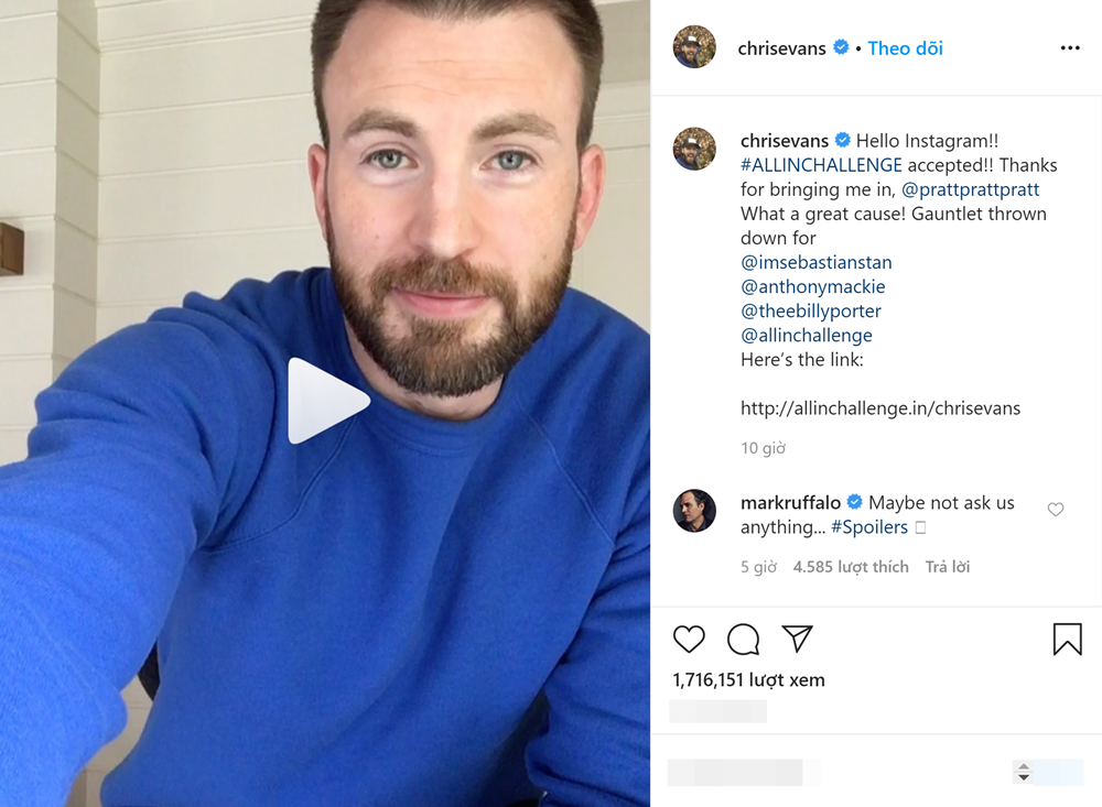 Tài khoản đạt chuẩn “người nổi tiếng” của Chris Evans: Không thèm theo dõi một ai cả! Động thái này của Đội trưởng Mỹ được cho là để tham gia thử thách mạng xã hội có tên gọi All-in Challenge. Chương trình này nơi mà các ngôi sao "cá kiếm" bằng cách thách thức nhau tham gia những thử thách khó nhằn và đặc biệt. Chris Evans đã thua cuộc Chris Pratt trong thử thách “bị con khủng long tại trường quay Jurassic World 3 ăn thịt”. Quyết tâm gỡ lại danh dự cho bản thân, “Đội trưởng Mỹ” đã thách đấu các fan Marvel giết Thanos bằng đôi bàn tay trắng. Những gương mặt quen thuộc như Robert Downey Jr., Scarlett Johansson, Chris Hemsworth, Mark Ruffalo và Jeremy Renner chắc chắn không thể vắng mặt trong cuộc vui này.