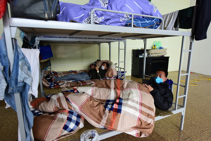 Hai tài xế Trần Văn Lực và Phạm Văn Toán đang giải trí bằng điện thoại trong khu cách ly. Các lái xe Việt Nam từ Hà Khẩu (Trung Quốc) trở về cửa khẩu Kim Thành được kiểm tra y tế và tập trung trong khu cách ly chờ chuyến xe tiếp theo.